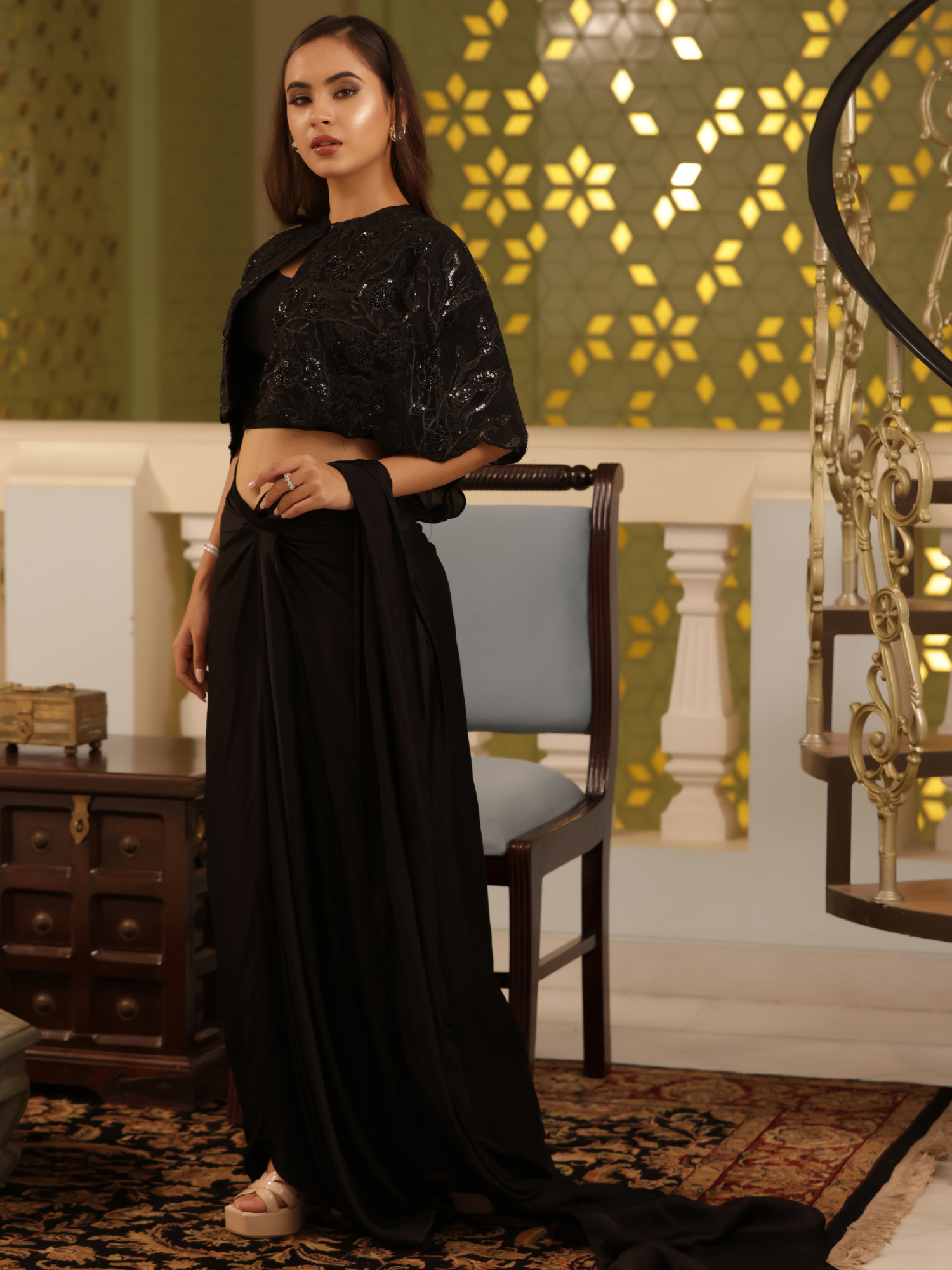 Heavy work cape with kardana,sequence and embroidery, comes with soft silk pre drape skirt and dupatta attached